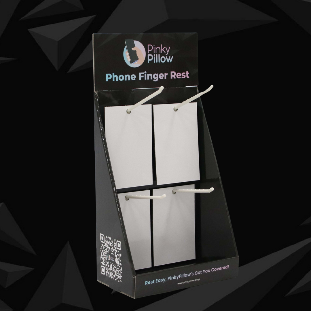 כאשר אתה רוכש את הסיטונאי של PinkyPillow, תקבל קופסת קרטון מותאמת אישית חינם לחנות הקמעונאית או לקיוסק שלך! תיבת תצוגה זו נועדה להציג 40 אחיזות של PinkyPillow בארבעה צבעים מרהיבים, עם 10 PinkyPillow לכל וו.