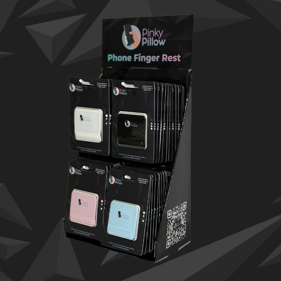 When you purchase PinkyPillow's wholesale, you'll receive a complimentary custom cardboard display box for your retail store or kiosk! This display box is designed to showcase 60 PinkyPillow's grips in four vibrant colors, with 15 PinkyPillow's per hook.